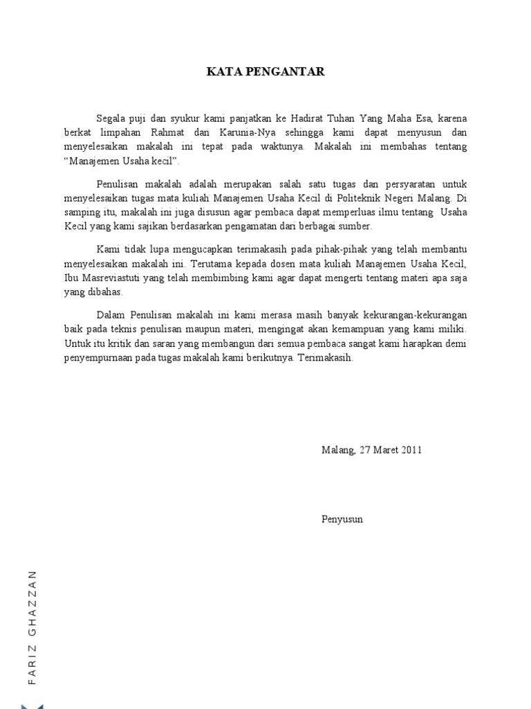 Kompilasi karya ilmiah dan non-ilmiah. Contoh Kata Pengantar. Contoh Kata Pengantar Laporan Kegiatan dalam menyusun karya tulis ilmiah yang meliputi skripsi makalah laporan proposal dll. Kata pengantar diperlukan dalam sebuah laporan untuk memberitahu penulis apa tujuan dan alasan dibuatnya laporan tersebut. Puji syukur kehadirat Allah subhanahu wataala yang telah mempergantikan siang dan malam dengan sempurna sehingga kami dapat melaksanakan study tour dengan selamat tanpa ada halangan apapun.
